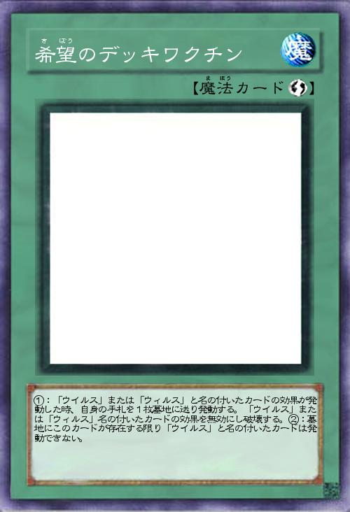 | ①:「ウイルス」または「ウィルス」と名の付いたカードの効果が発動した時、自身の手札を1枚墓地に送り発動する。「ウイルス」または「ウィルス」名の付いたカードの効果を無効にし破壊する。②:墓地にこのカードが存在する限り「ウイルス」と名の付いたカードは発動できない。 | |||