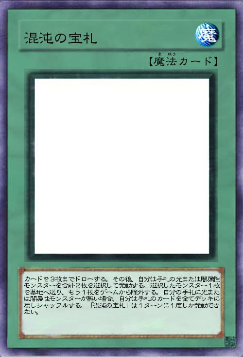 | カードを3枚までドローする。その後、自分は手札の光または闇属性モンスターを合計2枚を選択して発動する。選択したモンスター1枚を墓地へ送り、もう1枚をゲームから除外する。自分の手札に光または闇属性モンスターが無い場合、自分は手札のカードを全てデッキに戻しシャッフルする。「混沌の宝札」は1ターンに1度しか発動できない。 | |||