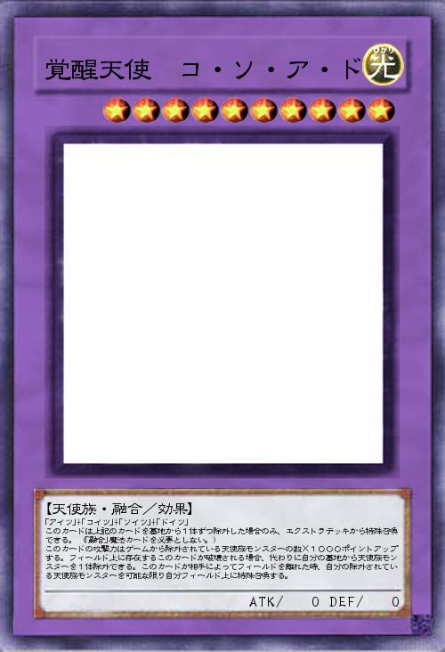 「アイツ」+「コイツ」+「ソイツ」+「ドイツ」 このカードは上記のカードを墓地から1体ずつ除外した場合のみ、エクストラデッキから特殊召喚できる。(「融合」魔法カードを必要としない。) このカードの攻撃力はゲームから除外されている天使族モンスターの数×1000ポイントアップする。フィールド上に存在するこのカードが破壊される場合、代わりに自分の墓地から天使族モンスターを1体除外できる。このカードが相手によってフィールドを離れた時、自分の除外されている天使族モンスターを可能な限り自分フィールド上に特殊召喚する。 |