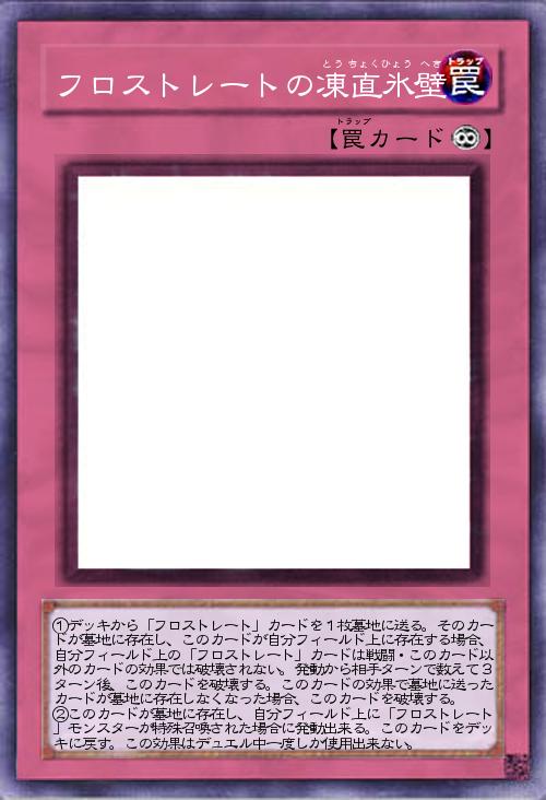 ①デッキから「フロストレート」カードを1枚墓地に送る。そのカードが墓地に存在し、このカードが自分フィールド上に存在する場合、自分フィールド上の「フロストレート」カードは戦闘・このカード以外のカードの効果では破壊されない。発動から相手ターンで数えて3ターン後、このカードを破壊する。このカードの効果で墓地に送ったカードが墓地に存在しなくなった場合、このカードを破壊する。 ②このカードが墓地に存在し、自分フィールド上に「フロストレート」モンスターが特殊召喚された場合に発動出来る。このカードをデッキに戻す。この効果はデュエル中一度しか使用出来ない。 |