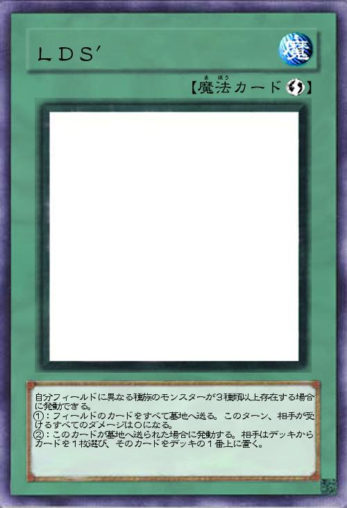 自分フィールドに異なる種族のモンスターが3種類以上存在する場合に発動できる。 ①:フィールドのカードをすべて墓地へ送る。このターン、相手が受けるすべてのダメージは0になる。 ②:このカードが墓地へ送られた場合に発動する。相手はデッキからカードを1枚選び、そのカードをデッキの1番上に置く。 |