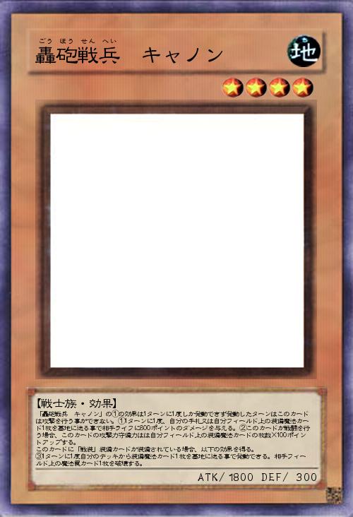 「轟砲戦兵 キャノン」の①の効果は1ターンに1度しか発動できず発動したターンはこのカードは攻撃を行う事ができない。①1ターンに1度、自分の手札又は自分フィールド上の装備魔法カード1枚を墓地に送る事で相手ライフに800ポイントのダメージを与える。②このカードが戦闘を行う場合、このカードの攻撃力守備力はは自分フィールド上の装備魔法カードの枚数×100ポイントアップする。 このカードに「戦装」装備カードが装備されている場合、以下の効果を得る。 ③1ターンに1度自分のデッキから装備魔法カード1枚を墓地に送る事で発動できる。相手フィールド上の魔法罠カード1枚を破壊する。 |