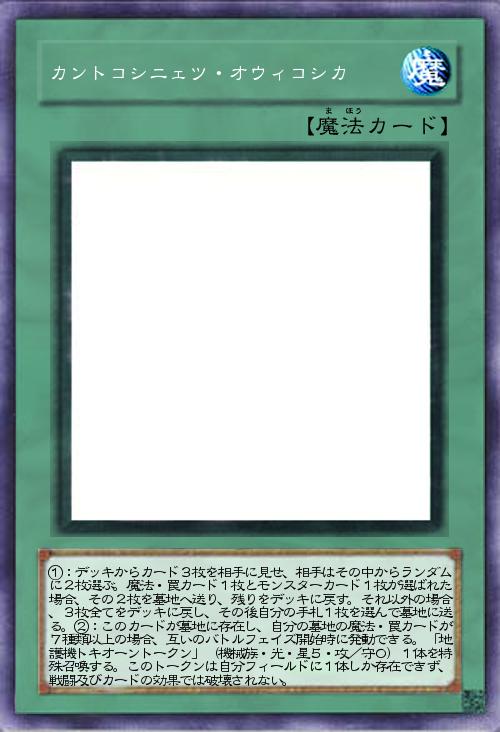 | ①:デッキからカード3枚を相手に見せ、相手はその中からランダムに2枚選ぶ。魔法・罠カード1枚とモンスターカード1枚が選ばれた場合、その2枚を墓地へ送り、残りをデッキに戻す。それ以外の場合、3枚全てをデッキに戻し、その後自分の手札1枚を選んで墓地に送る。②:このカードが墓地に存在し、自分の墓地の魔法・罠カードが7種類以上の場合、互いのバトルフェイズ開始時に発動できる。「地護機トキオーントークン」(機械族・光・星5・攻/守0)1体を特殊召喚する。このトークンは自分フィールドに1体しか存在できず、戦闘及びカードの効果では破壊されない。 | |||