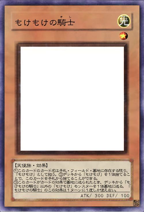 ①このカードのカード名は手札・フィールド・墓地に存在する限り、「もけもけ」として扱う。②デッキから「もけもけ」を1体捨てることで、このカードを手札から捨てることができる。 ③このカードがカードの効果で墓地に送られたとき、デッキから「もけもけの騎士」以外の「もけもけ」モンスターを1体墓地に送る。「もけもけの騎士」のこの効果は1ターンに1度しか使えない。 |
