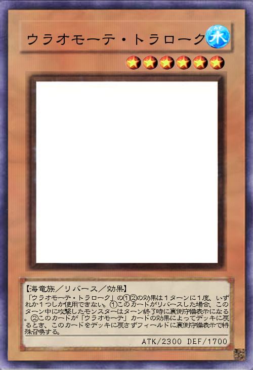 「ウラオモーテ・トラローク」の①②の効果は1ターンに1度、いずれか1つしか使用できない。①このカードがリバースした場合、このターン中に攻撃したモンスターはターン終了時に裏側守備表示になる。②このカードが「ウラオモーテ」カードの効果によってデッキに戻るとき、このカードをデッキに戻さずフィールドに裏側守備表示で特殊召喚する。 |