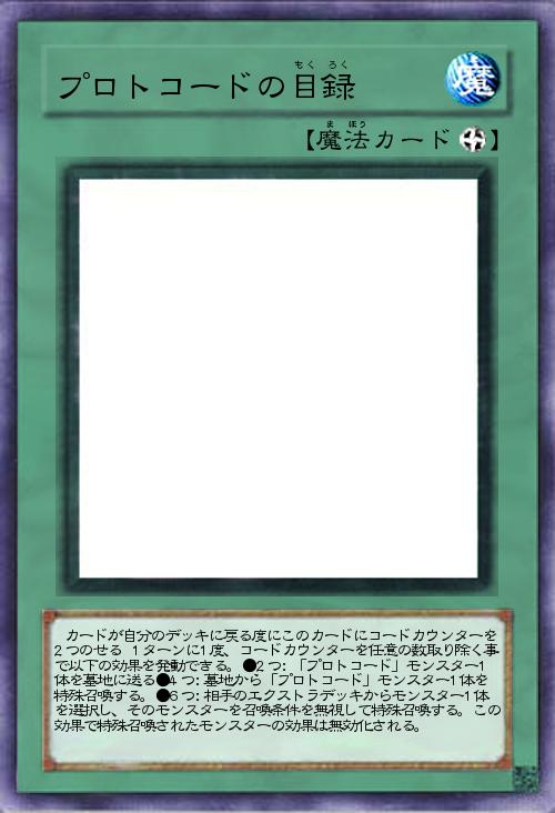 | ⑴カードが自分のデッキに戻る度にこのカードにコードカウンターを2つのせる⑵1ターンに1度、コードカウンターを任意の数取り除く事で以下の効果を発動できる。●2つ:「プロトコード」モンスター1体を墓地に送る●4つ:墓地から「プロトコード」モンスター1体を特殊召喚する。●6つ:相手のエクストラデッキからモンスター1体を選択し、そのモンスターを召喚条件を無視して特殊召喚する。この効果で特殊召喚されたモンスターの効果は無効化される。 | |||