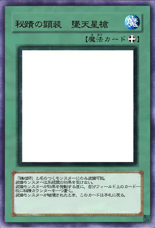 「錬成師」と名のつくモンスターにのみ装備可能。 装備モンスターは永続罠の効果を受けない。 装備モンスターが効果を発動する度に、自分フィールド上のカード一枚に秘蹟カウンターを一つ置く。 装備モンスターが破壊されたとき、このカードは手札に戻る。 |