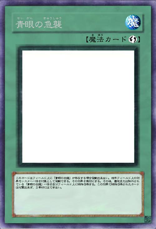 | このカードはフィールド上に「青眼の白龍」が存在する場合発動出来ない。相手フィールド上の効果モンスター一体を対象として発動できる。その効果を無効にする。その後、墓地または除外されている「青眼の白龍」一体を自分フィールド上に特殊召喚する。この効果で特殊召喚されたカードは攻撃出来ず、S素材にはできない。 | |||