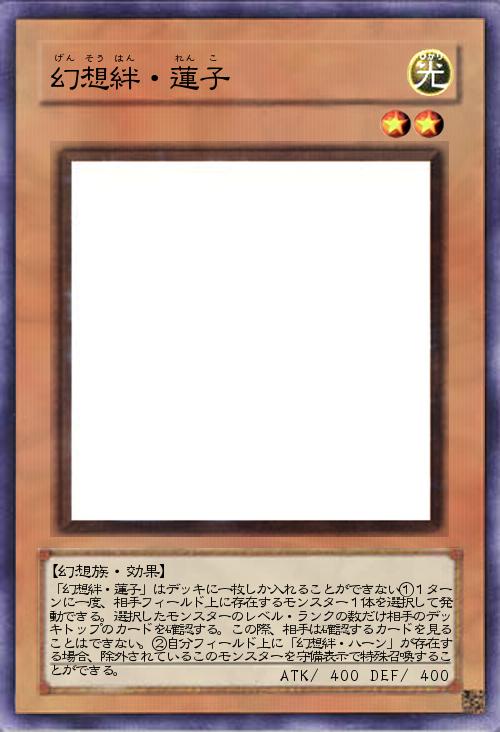| 「幻想絆・蓮子」はデッキに一枚しか入れることができない①1ターンに一度、相手フィールド上に存在するモンスター1体を選択して発動できる。選択したモンスターのレベル・ランクの数だけ相手のデッキトップのカードを確認する。この際、相手は確認するカードを見ることはできない。②自分フィールド上に「幻想絆・ハーン」が存在する場合、除外されているこのモンスターを守備表示で特殊召喚することができる。 | |||