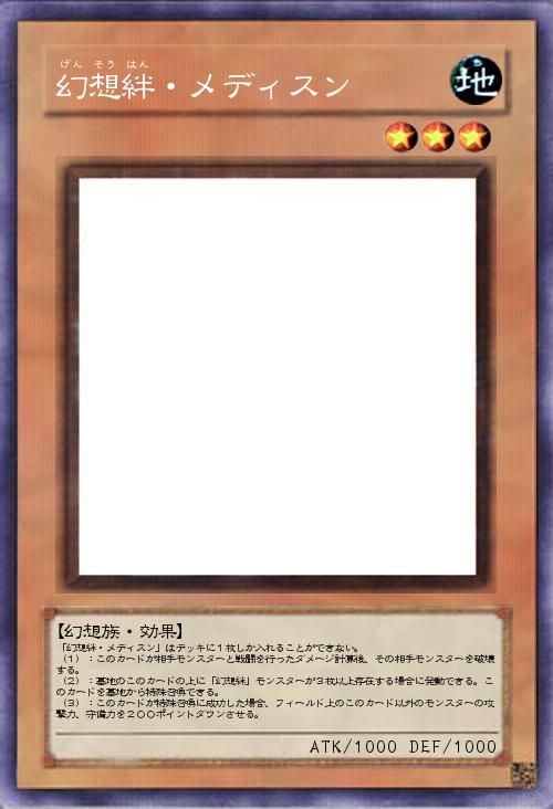 「幻想絆・メディスン」はデッキに1枚しか入れることができない。 (1):このカードが相手モンスターと戦闘を行ったダメージ計算後、その相手モンスターを破壊する。 (2):墓地のこのカードの上に「幻想絆」モンスターが3枚以上存在する場合に発動できる。このカードを墓地から特殊召喚できる。 (3):このカードが特殊召喚に成功した場合、フィールド上のこのカード以外のモンスターの攻撃力、守備力を200ポイントダウンさせる。 |