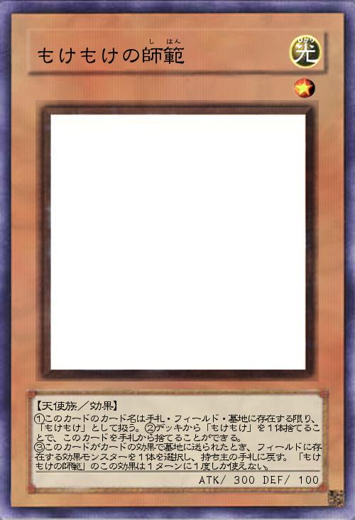 ①このカードのカード名は手札・フィールド・墓地に存在する限り、「もけもけ」として扱う。②デッキから「もけもけ」を1体捨てることで、このカードを手札から捨てることができる。 ③このカードがカードの効果で墓地に送られたとき、フィールドに存在する効果モンスターを1体を選択し、持ち主の手札に戻す。「もけもけの師範」のこの効果は1ターンに1度しか使えない。 |