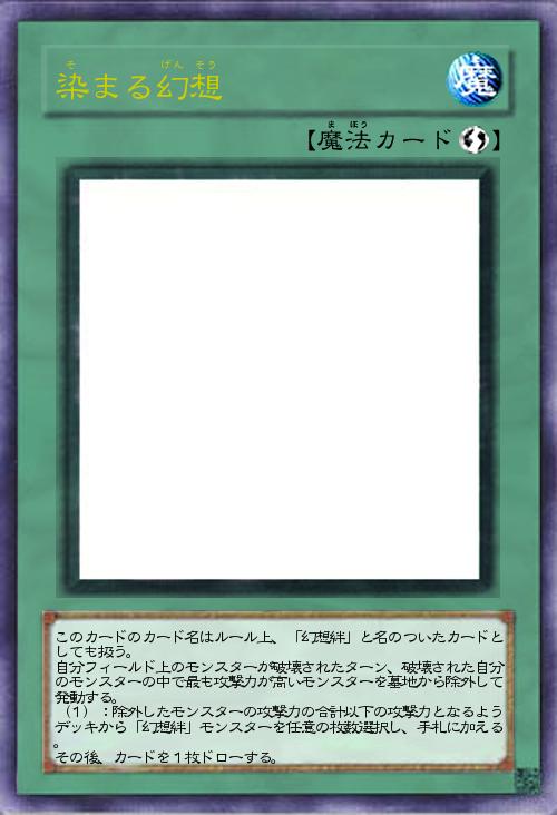 このカードのカード名はルール上、「幻想絆」と名のついたカードとしても扱う。 自分フィールド上のモンスターが破壊されたターン、破壊された自分のモンスターの中で最も攻撃力が高いモンスターを墓地から除外して発動する。 (1):除外したモンスターの攻撃力の合計以下の攻撃力となるようデッキから「幻想絆」モンスターを任意の枚数選択し、手札に加える。 その後、カードを1枚ドローする。 |
