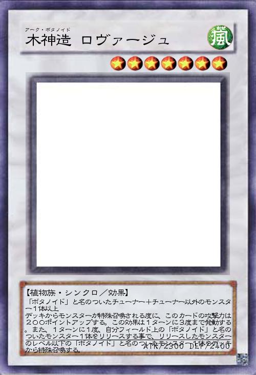「ボタノイド」と名のついたチューナー+チューナー以外のモンスター1体以上 デッキからモンスターが特殊召喚される度に、このカードの攻撃力は200ポイントアップする。この効果は1ターンに3度まで発動する。また、1ターンに1度、自分フィールド上の「ボタノイド」と名のついたモンスター1体をリリースする事で、リリースしたモンスターのレベル以下の「ボタノイド」と名のついたモンスター1体をデッキから特殊召喚する。 |