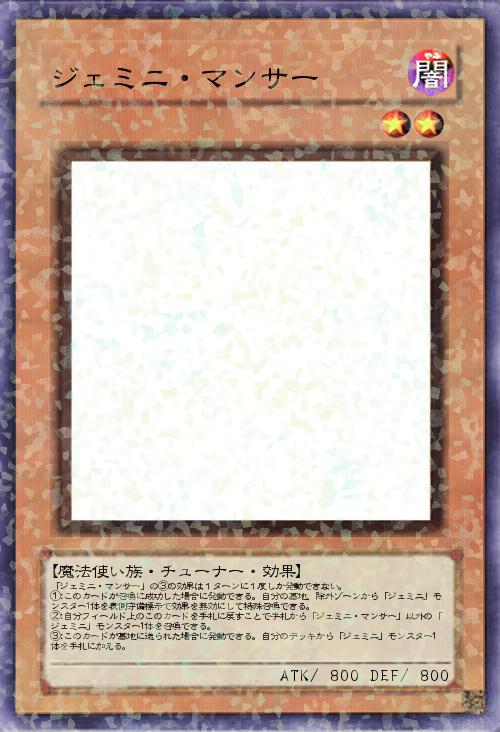 「ジェミニ・マンサー」の③の効果は1ターンに1度しか発動できない。 ①:このカードが召喚に成功した場合に発動できる。自分の墓地、除外ゾーンから「ジェミニ」モンスター1体を表側守備標示で効果を無効にして特殊召喚できる。 ②:自分フィールド上のこのカードを手札に戻すことで手札から「ジェミニ・マンサー」以外の「ジェミニ」モンスター1体を召喚できる。 ③:このカードが墓地に送られた場合に発動できる。自分のデッキから「ジェミニ」モンスター1体を手札に加える。 |