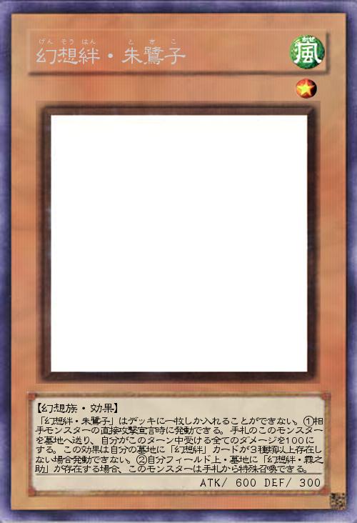 | 「幻想絆・朱鷺子」はデッキに一枚しか入れることができない。①相手モンスターの直接攻撃宣言時に発動できる。手札のこのモンスターを墓地へ送り、自分がこのターン中受ける全てのダメージを100にする。この効果は自分の墓地に「幻想絆」カードが3種類以上存在しない場合発動できない。②自分フィールド上・墓地に「幻想絆・霖之助」が存在する場合、このモンスターは手札から特殊召喚できる。 | |||