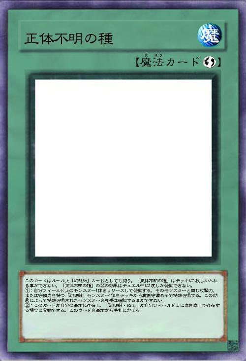 このカードはルール上「幻想絆」カードとしても扱う。「正体不明の種」はデッキに1枚しか入れる事ができない。「正体不明の種」の②の効果はデュエル中に1度しか発動できない。 ①:自分フィールド上のモンスター1体をリリースして発動する。そのモンスターと同じ攻撃力、または守備力を持つ「幻想絆」モンスター1体をデッキから裏側守備表示で特殊召喚する。この効果によって特殊召喚されたモンスターを相手は確認する事ができない。 ②:このカードが自分の墓地に存在し、「幻想絆・ぬえ」が自分フィールド上に表側表示で存在する場合に発動できる。このカードを墓地から手札に加える。 |
