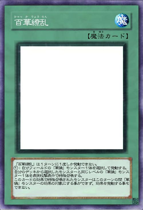 「百華繚乱」は1ターンに1度しか発動できない。 ①:自分フィールドの「華憐」モンスター1体を選択して発動する。 自分のデッキから選択したモンスターと同じレベルの「華憐」モンスター1体を表側攻撃表示で特殊召喚する。 このカードの効果で特殊召喚されたモンスターはこのターンの間「華憐」モンスターの効果の対象にする事ができず、効果を発動する事もできない。 |