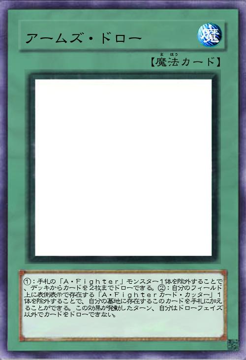| ①:手札の「A・Fighter」モンスター1体を除外することで、デッキからカードを2枚までドローできる。②:自分のフィールド上に表側表示で存在する「A・Fighterカード・カッター」1体を除外することで、自分の墓地に存在するこのカードを手札に加えることができる。この効果が発動したターン、自分はドローフェイズ以外でカードをドローできない。 | |||
