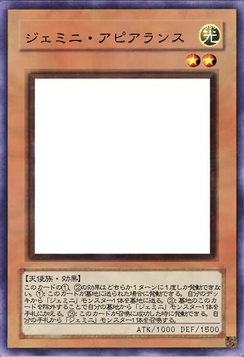 | このカードの①、②の効果はどちらか1ターンに1度しか発動できない。①:このカードが墓地に送られた場合に発動できる。自分のデッキから「ジェミニ」モンスター1体を墓地に送る。②:墓地のこのカードを除外することで自分の墓地から「ジェミニ」モンスター1体を手札に加える。③:このカードが召喚に成功した時に発動できる。自分の手札から「ジェミニ」モンスター1体を召喚する。 | |||