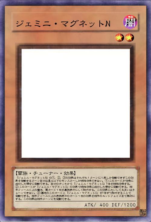 | 「ジェミニ・マグネットN」の①、②、③の効果はそれぞれ1ターンに1度しか発動できずこの効果を発動するターン自分は星4以下のモンスターしか特殊召喚できない。①:このカードが召喚に成功した場合に発動できる。自分のデッキから「ジェミニ・マグネットS」1体を特殊召喚する。②:このカードが「ジェミニ・マグネットS」の効果で特殊召喚に成功した場合に発動できる。相手フィールド上の魔法、罠カード1枚を裏側表示にして除外する。この効果にたいしてお互いはチェーンできない。③:墓地のこのカードと「ジェミニ・マグネットS」を1体ずつ除外することで発動できる。相手フィールド上の表側表示のカード1枚の効果を相手のエンドフェイズまで無効にする。この効果は相手ターンにも発動できる。 | |||