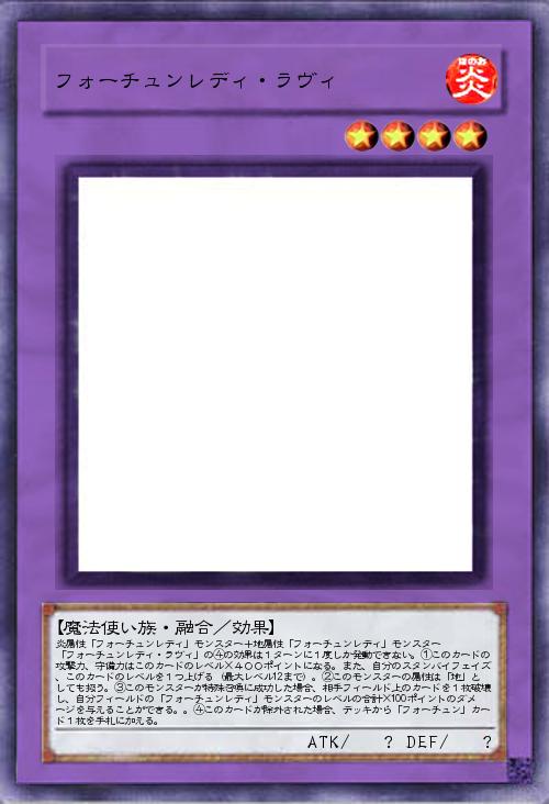 炎属性「フォーチュンレディ」モンスター+地属性「フォーチュンレディ」モンスター 「フォーチュンレディ・ラヴィ」の④の効果は1ターンに1度しか発動できない。①このカードの攻撃力、守備力はこのカードのレベル×400ポイントになる。また、自分のスタンバイフェイズ、このカードのレベルを1つ上げる(最大レベル12まで)。②このモンスターの属性は「地」としても扱う。③このモンスターが特殊召喚に成功した場合、相手フィールド上のカードを1枚破壊し、自分フィールドの「フォーチュンレディ」モンスターのレベルの合計×100ポイントのダメージを与えることができる。。④このカードが除外された場合、デッキから「フォーチュン」カード1枚を手札に加える。 |