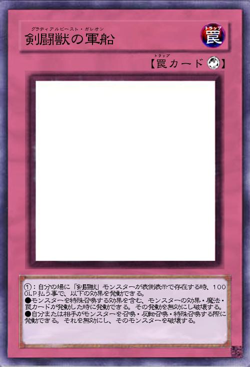 ①:自分の場に「剣闘獣」モンスターが表側表示で存在する時、1000LP払う事で、以下の効果を発動できる。 ●モンスターを特殊召喚する効果を含む、モンスターの効果・魔法・罠カードが発動した時に発動できる。その発動を無効にし破壊する。 ●自分または相手がモンスターを召喚・反転召喚・特殊召喚する際に発動できる。それを無効にし、そのモンスターを破壊する。 |