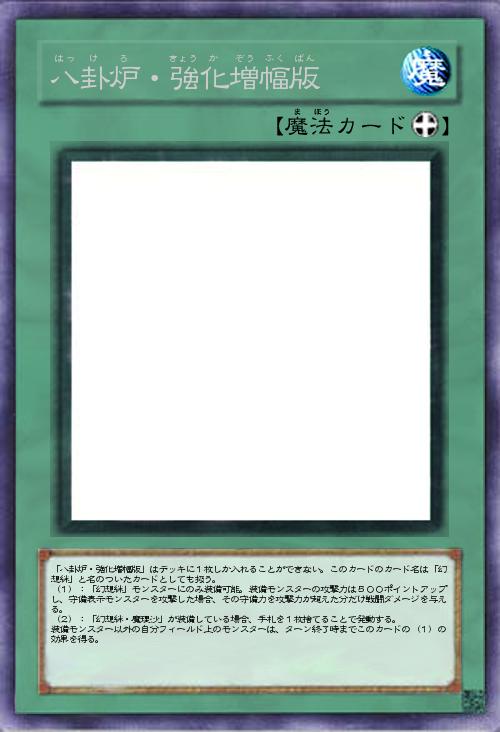 「八卦炉・強化増幅版」はデッキに1枚しか入れることができない。このカードのカード名は「幻想絆」と名のついたカードとしても扱う。 (1):「幻想絆」モンスターにのみ装備可能。装備モンスターの攻撃力は500ポイントアップし、守備表示モンスターを攻撃した場合、その守備力を攻撃力が超えた分だけ戦闘ダメージを与える。 (2):「幻想絆・魔理沙」が装備している場合、手札を1枚捨てることで発動する。 装備モンスター以外の自分フィールド上のモンスターは、ターン終了時までこのカードの(1)の効果を得る。 |