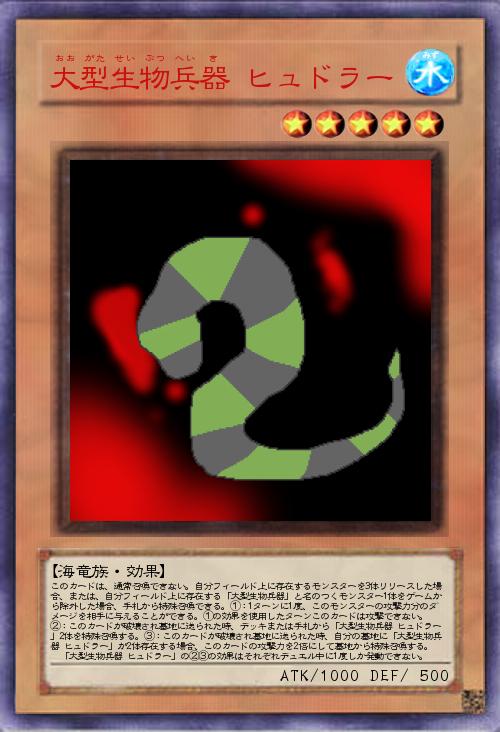 このカードは、通常召喚できない。自分フィールド上に存在するモンスターを3体リリースした場合、または、自分フィールド上に存在する「大型生物兵器」と名のつくモンスター1体をゲームから除外した場合、手札から特殊召喚できる。①:1ターンに1度、このモンスターの攻撃力分のダメージを相手に与えることができる。①の効果を使用したターンこのカードは攻撃できない。 ②:このカードが破壊され墓地に送られた時、デッキまたは手札から「大型生物兵器 ヒュドラー」2体を特殊召喚する。③:このカードが破壊され墓地に送られた時、自分の墓地に「大型生物兵器 ヒュドラー」が2体存在する場合、このカードの攻撃力を2倍にして墓地から特殊召喚する。 「大型生物兵器 ヒュドラー」の②③の効果はそれぞれデュエル中に1度しか発動できない。 |