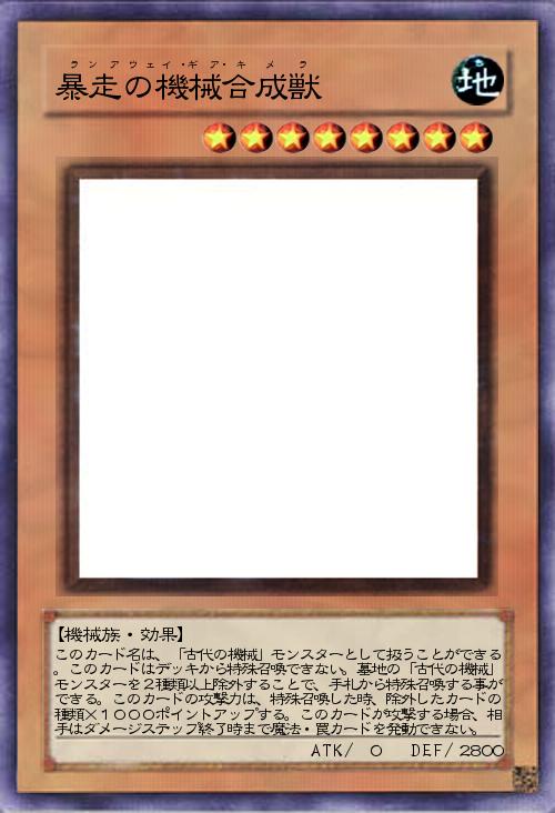 | このカード名は、「古代の機械」モンスターとして扱うことができる。このカードはデッキから特殊召喚できない。墓地の「古代の機械」モンスターを2種類以上除外することで、手札から特殊召喚する事ができる。このカードの攻撃力は、特殊召喚した時、除外したカードの種類×1000ポイントアップする。このカードが攻撃する場合、相手はダメージステップ終了時まで魔法・罠カードを発動できない。 | |||