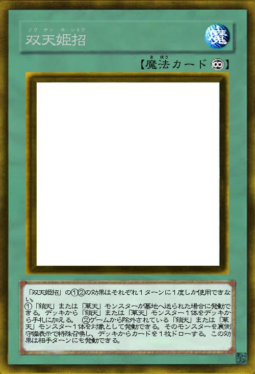 「双天姫招」の①②の効果はそれぞれ1ターンに1度しか使用できない。 ①「鎖天」または「華天」モンスターが墓地へ送られた場合に発動できる。デッキから「鎖天」または「華天」モンスター1体をデッキから手札に加える。 ②ゲームから除外されている「鎖天」または「華天」モンスター1体を対象として発動できる。そのモンスターを裏側守備表示で特殊召喚し、デッキからカードを1枚ドローする。この効果は相手ターンにも発動できる。 |