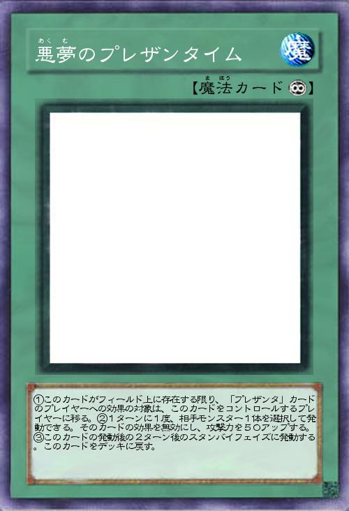 | ①このカードがフィールド上に存在する限り、「プレザンタ」カードのプレイヤーへの効果の対象は、このカードをコントロールするプレイヤーに移る。②1ターンに1度、相手モンスター1体を選択して発動できる。そのカードの効果を無効にし、攻撃力を50アップする。③このカードの発動後の2ターン後のスタンバイフェイズに発動する。このカードをデッキに戻す。 | |||