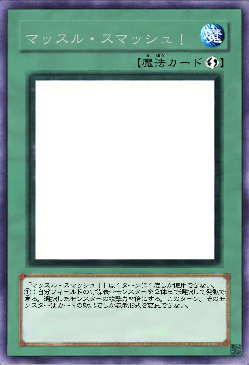 「マッスル・スマッシュ!」は1ターンに1度しか使用できない。 ①:自分フィールドの守備表示モンスターを2体まで選択して発動できる。選択したモンスターの攻撃力を倍にする。このターン、そのモンスターはカードの効果でしか表示形式を変更できない。 |