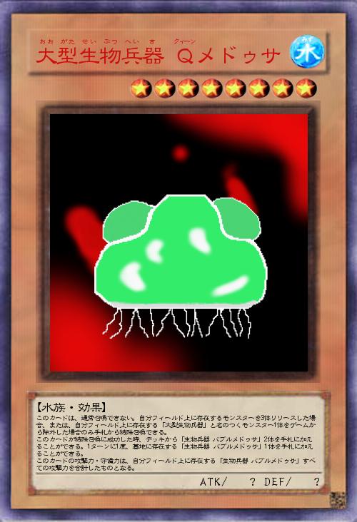 このカードは、通常召喚できない。自分フィールド上に存在するモンスターを3体リリースした場合、または、自分フィールド上に存在する「大型生物兵器」と名のつくモンスター1体をゲームから除外した場合のみ手札から特殊召喚できる。 このカードが特殊召喚に成功した時、デッキから「生物兵器 バブルメドゥサ」2体を手札に加えることができる。1ターンに1度、墓地に存在する「生物兵器 バブルメドゥサ」1体を手札に加えることができる。 このカードの攻撃力・守備力は、自分フィールド上に存在する「生物兵器 バブルメドゥサ」すべての攻撃力を合計したものとなる。 |