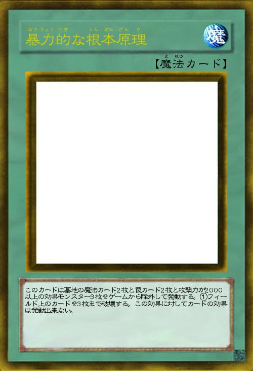 | このカードは墓地の魔法カード2枚と罠カード2枚と攻撃力が2000以上の効果モンスター3枚をゲームから除外して発動する。①フィールド上のカードを3枚まで破壊する。この効果に対してカードの効果は発動出来ない。 | |||