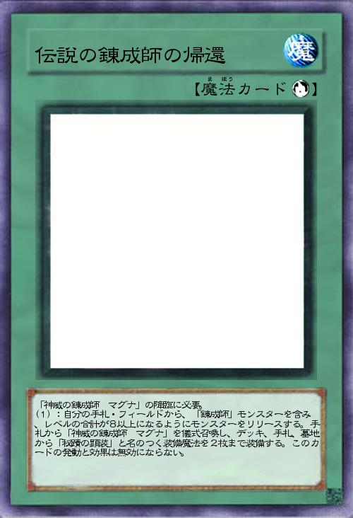 「神威の錬成師 マグナ」の降臨に必要。このカードの発動と効果は無効にならない。(1):自分の手札・フィールドから、レベルの合計が8以上になるように「錬成師」モンスターを含むモンスターをリリースし、手札から「神威の錬成師 マグナ」を儀式召喚する。その後、自分のデッキ・手札・墓地の「秘蹟の顕装」装備魔法カードを2枚まで選んで、儀式召喚したモンスターに装備できる。」(2014-12-06 18:16)