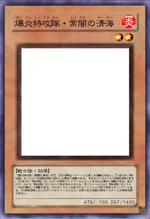 | 「爆炎特攻隊・常闇の清海」の②、③の効果は1ターンに2度しか発動できない。①:自分が「特攻隊」モンスターの特殊召喚に成功した場合に発動できる。手札からこのカードを特殊召喚できる。②:自分の「特攻隊」モンスターが相手プレイヤーにダメージを与えた場合に発動できる。自分のデッキから「特攻隊」モンスター1体を手札に加える。③:フィールド上の「特攻隊」モンスター1体を選択して発動できる。そのモンスターは自分のエンドフェイズ終了時までチューナーとなる。④:特殊召喚したこのカードがフィールド上にいる限り自分は戦士族モンスターしか特殊召喚できない。 | |||