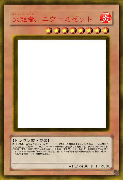 | ①「火想者、ニヴ=ミゼット」はフィールド上に1枚しか存在出来ない。②このカードは水属性としても扱う。②1ターンに1度、このカードの表示形式を変更して発動する。デッキからカードを1枚ドローする。③自分がデッキからカードをドローする度、ドローしたカード1枚につき300ポイントのダメージを相手プレイヤーに与える。④このカードを墓地から特殊召喚する場合、追加コストとして魔法カードを1枚墓地に送る。 | |||