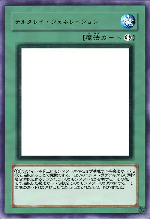 | ①自分フィールド上にモンスターが存在せず墓地の同名魔法カード3枚を選択することで発動できる。自分のエクストラデッキからX素材を3体指定するランク4以下のXモンスターをX召喚する。その後、その選択した魔法カード3枚をそのXモンスターのX素材にする。その魔法カードはX素材として墓地に送られた場合、除外される。 | |||