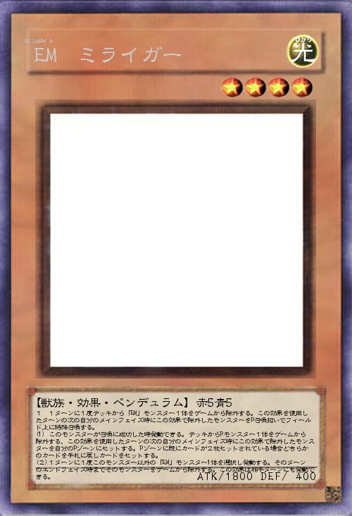1 1ターンに1度デッキから「EM」モンスター1体をゲームから除外する。この効果を使用したターンの次の自分のメインフェイズ時にこの効果で除外したモンスターをP召喚扱いでフィールド上に特殊召喚する。 (1) このモンスターが召喚に成功した時発動できる。デッキからPモンスター1体をゲームから除外する、この効果を使用したターンの次の自分のメインフェイズ時にこの効果で除外したモンスターを自分のPゾーンにセットする。Pゾーンに既にカードが2枚セットされている場合どちらかのカードを手札に戻しカードをセットする。 (2)1ターンに1度このモンスター以外の「EM」モンスター1体を選択し発動する。そのターンのエンドフェイズ時までそのモンスターをゲームから除外する。この効果は相手ターンにも発動できる。 |