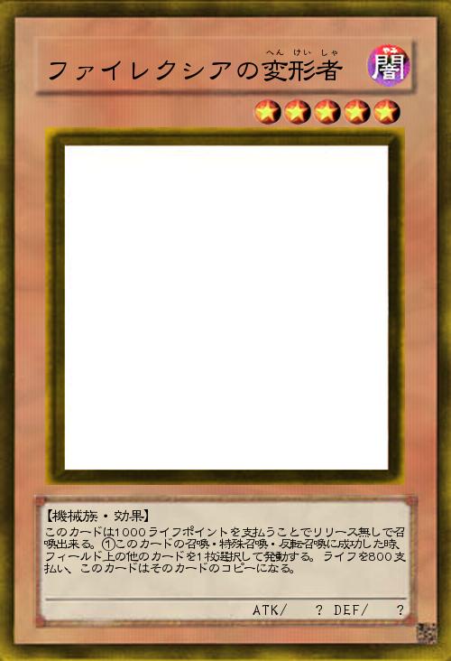 | このカードは1000ライフポイントを支払うことでリリース無しで召喚出来る。①このカードの召喚・特殊召喚・反転召喚に成功した時、フィールド上の他のカードを1枚選択して発動する。ライフを800支払い、このカードはそのカードのコピーになる。 | |||