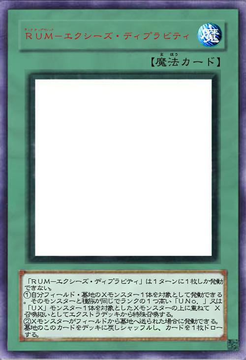 「RUM-エクシーズ・ディプラビティ」は1ターンに1枚しか発動できない。 ①自分フィールド・墓地のXモンスター1体を対象として発動できる。そのモンスターと種族が同じでランクの1つ高い「UNo.」又は「UX」モンスター1体を対象としたXモンスターの上に重ねて X召喚扱いとしてエクストラデッキから特殊召喚する。 ②Xモンスターがフィールドから墓地へ送られた場合に発動できる。墓地のこのカードをデッキに戻しシャッフルし、カードを1枚ドローする。 |