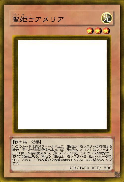 | ①このカードは自分フィールド上に「聖姫士」モンスターが存在する場合、手札から特殊召喚出来る。②「聖姫士アメリア」はフィールド上に1体しか存在出来ない。③1ターンに1度、このカードが攻撃する時に発動出来る。墓地の「聖姫士」モンスターを1枚ゲームから除外し、このカードの攻撃力を攻撃対象のモンスターの攻撃力分アップする。 | |||