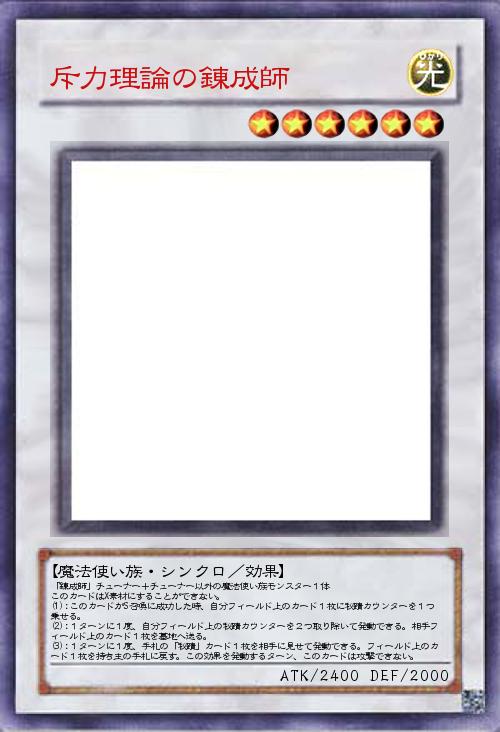 「錬成師」チューナー+チューナー以外の魔法使い族モンスター1体 このカードはX素材にすることができない。 (1):このカードがS召喚に成功した時、自分フィールド上のカード1枚に秘蹟カウンターを1つ乗せる。 (2):1ターンに1度、自分フィールド上の秘蹟カウンターを2つ取り除いて発動できる。相手フィールド上のカード1枚を墓地へ送る。 (3):1ターンに1度、手札の「秘蹟」カード1枚を相手に見せて発動できる。フィールド上のカード1枚を持ち主の手札に戻す。この効果を発動するターン、このカードは攻撃できない。 |