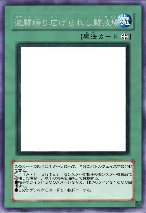 このカードの効果は1ターンに一度、自分のバトルフェイズ時に発動できる。 ①:「A・Fighter」モンスターが相手のモンスターを戦闘で破壊した場合に、以下の効果を選択して発動する。 ●相手のライフに500ダメージを与え、自分のライフを1000回復する。 ●自分はデッキからカードを1枚ドローする。 |