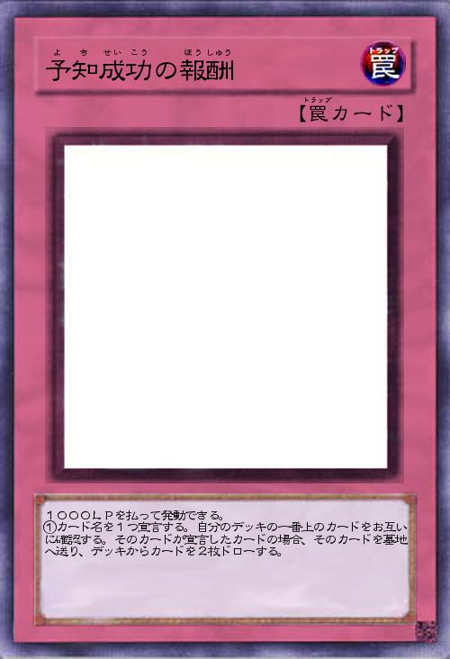 1000LPを払って発動できる。 ①カード名を1つ宣言する。自分のデッキの一番上のカードをお互いに確認する。そのカードが宣言したカードの場合、そのカードを墓地へ送り、デッキからカードを2枚ドローする。 |