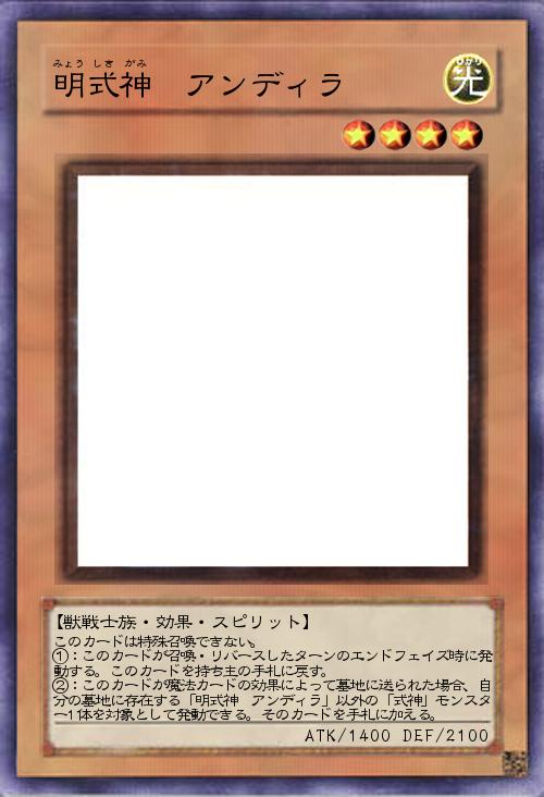 このカードは特殊召喚できない。 ①:このカードが召喚・リバースしたターンのエンドフェイズ時に発動する。このカードを持ち主の手札に戻す。 ②:このカードが魔法カードの効果によって墓地に送られた場合、自分の墓地に存在する「明式神 アンディラ」以外の「式神」モンスター1体を対象として発動できる。そのカードを手札に加える。 |