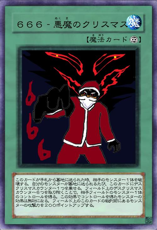| このカードが手札から墓地に送られた時、相手のモンスター1体を破壊する。自分のモンスターが墓地に送られるたび、このカードにデスクリスマスカウンター1つを乗せる。フィールド上のデスクリスマスカウンター6つを取り除くことで、相手フィールドのモンスター1体のコントロールを得る。この効果でコントロールを得たモンスターの効果は無効になる。フィールド上のこのカードの縦列前にあるモンスターの攻撃力を200ポイントアップする。 | |||