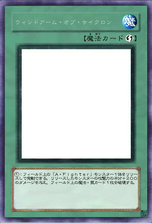 | ①:フィールド上の「A・Fighter」モンスター1体をリリースしで発動できる。リリースしたモンスターの攻撃力の半分+200のダメージを与え、フィールド上の魔法・罠カード1枚を破壊する。 | |||