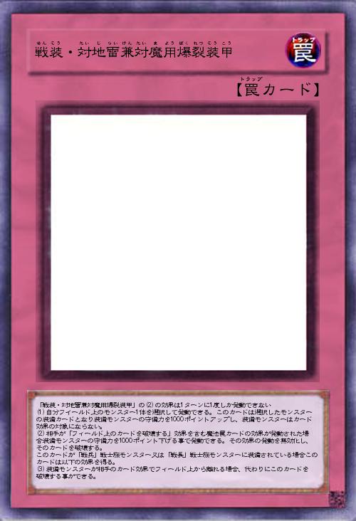 「戦装・対地雷兼対魔用爆裂装甲」の(2)の効果は1ターンに1度しか発動できない (1)自分フイールド上のモンスター1体を選択して発動できる。このカードは選択したモンスターの装備カードとなり装備モンスターの守備力を1000ポイントアップし、装備モンスターはカード効果の対象にならない。 (2)相手が「フィールド上のカードを破壊する」効果を含む魔法罠カードの効果が発動された場合装備モンスターの守備力を1000ポイント下げる事で発動できる。その効果の発動を無効化し、そのカードを破壊する。 このカードが「戦兵」戦士族モンスター又は「戦長」戦士族モンスターに装備されている場合このカードは以下の効果を得る。 (3)装備モンスターが相手のカード効果でフィールド上から離れる場合、代わりにこのカードを破壊する事ができる。 |