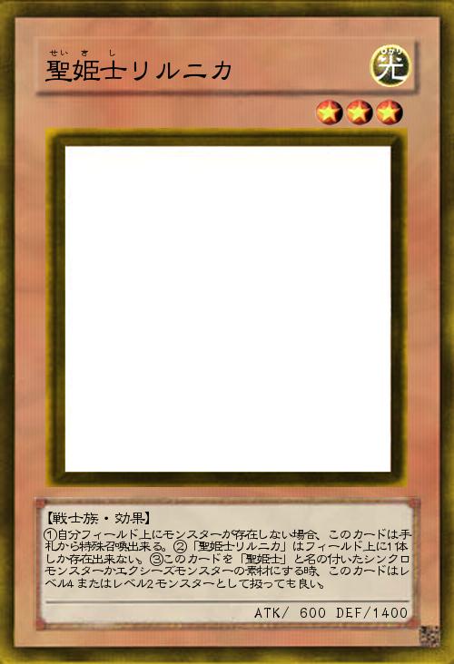 | ①自分フィールド上にモンスターが存在しない場合、このカードは手札から特殊召喚出来る。②「聖姫士リルニカ」はフィールド上に1体しか存在出来ない。③このカードを「聖姫士」と名の付いたシンクロモンスターかエクシーズモンスターの素材にする時、このカードはレベル4またはレベル2モンスターとして扱っても良い。 | |||